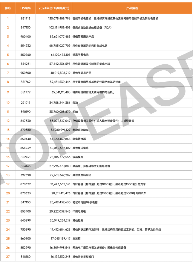 2024年中国出口百大产品及贸易伙伴排名统计数据