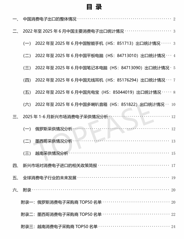 主要内客介绍:中国消费电子行业的出口的整体情况,涵盖2022-2025年中国消费电子行业主要产品出口统计情况(产品HS编码),25年新兴市场采购商价值分析,市场准入流程、合规要求、贸易促进机构资源;贸易风险(关税壁垒、文化差异等)及应对方案。