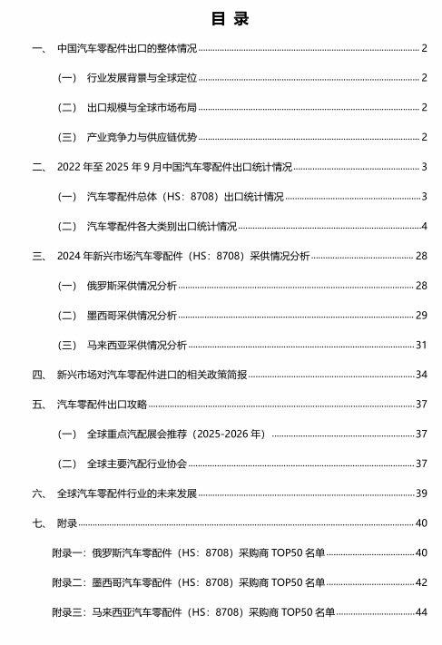 主要内客介绍:中国汽车零配件行业的出口的整体情况,涵盖2022-2025年中国汽车零配件行业主要产品出口统计情况(产品HS编码),25年新兴市场采购商价值分析,市场准入流程、合规要求、贸易促进机构资源;贸易风险(关税壁垒、文化差异等)及应对方案。