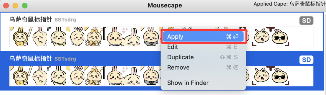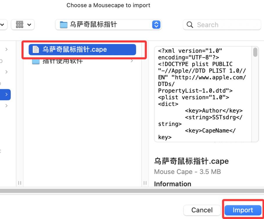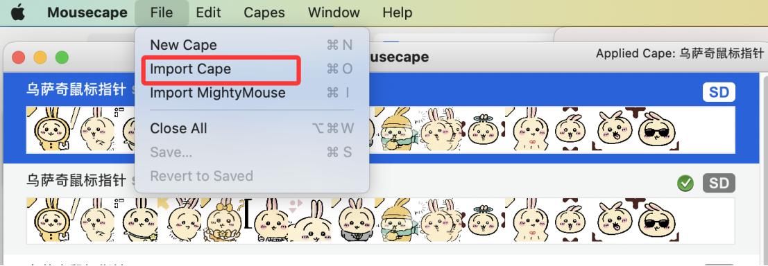 下载后双击解压,解压后里面有一个指针使用软件文件夹,双击打开,双击里面的mousecape软件,左上角有一个file,点一下,点击import cape,会打开一个文件夹让你选,你切换到下载后解压的文件夹内,选择乌萨奇鼠标指针.cape文件,点击import导入,接下来在mousecape软件内,鼠标右键你导入的指针,点击apply应用即可。