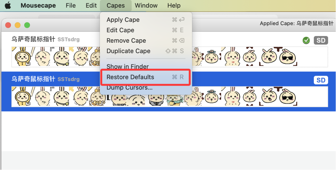 如果你不想用乌萨奇的指针,想要恢复默认的,打开mousecape软件,点击左上角的capes,点击restore defaults即可。