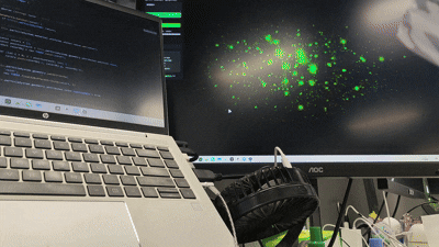它的视觉表现极具张力:深空暗调背景里点缀着细碎星点,荧光绿与暖黄渐变的粒子,能随交互切换多种形态 —— 时而聚拢成凌厉的剑形(粒子高密度收束出清晰轮廓),时而舒展如流光般穿梭(粒子轨迹舒展带出动感拖影),时而炸裂似星芒绽放(粒子向四周迸射,形成绚烂的扩散效果),色彩通透且粒子动态层次分明。