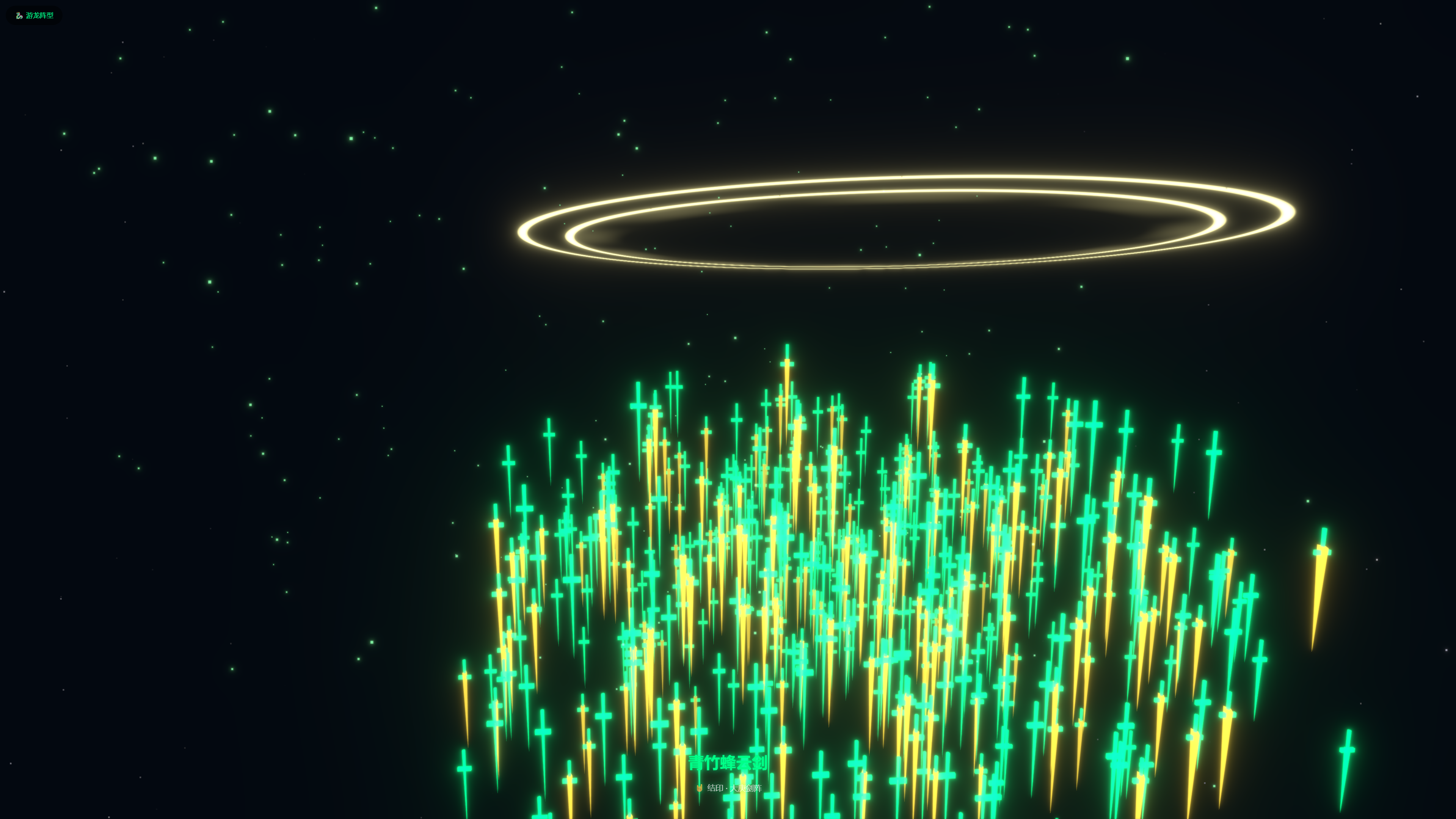 它的视觉表现极具张力:深空暗调背景里点缀着细碎星点,荧光绿与暖黄渐变的粒子,能随交互切换多种形态 —— 时而聚拢成凌厉的剑形(粒子高密度收束出清晰轮廓),时而舒展如流光般穿梭(粒子轨迹舒展带出动感拖影),时而炸裂似星芒绽放(粒子向四周迸射,形成绚烂的扩散效果),色彩通透且粒子动态层次分明。